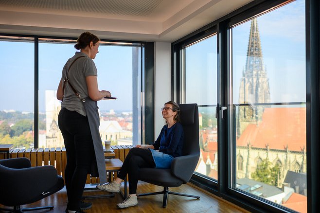Den Blick über Münster schweifen lassen und sich dabei bequem zurücklehnen: Die ehemalige Stadtverwaltungskantine wurde zu einer modernen Gastronomie umgebaut. Die Lounge „1648“ im elften und zwölften Stock des Stadthauses I in Münster ist ebenfalls ein Inklusionsbetrieb der Alexianer. Die Hälfte der 28 Arbeitsplätze wird von Menschen mit Behinderung ausgefüllt. Ziel ist es hier auch, Behinderte und Nicht-Behinderte in Kontakt zu bringen und die Beschäftigten für den sogenannten ersten Arbeitsmarkt fit zu machen.